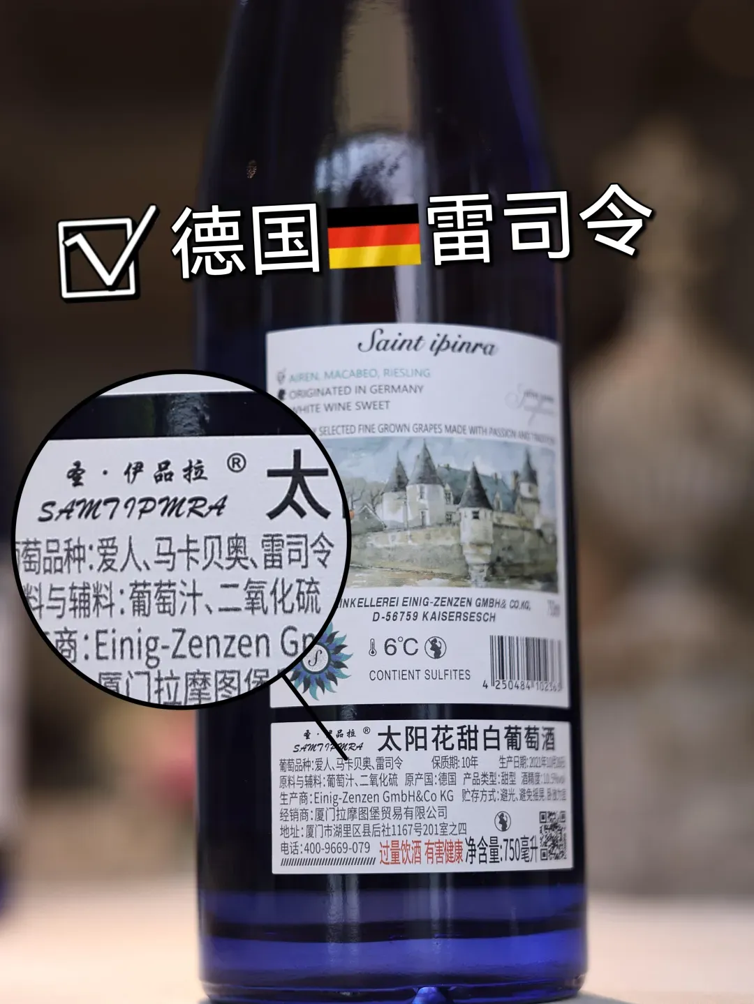 我们来看这瓶 太阳花雷司令甜白葡萄酒的背标,明确写明了: