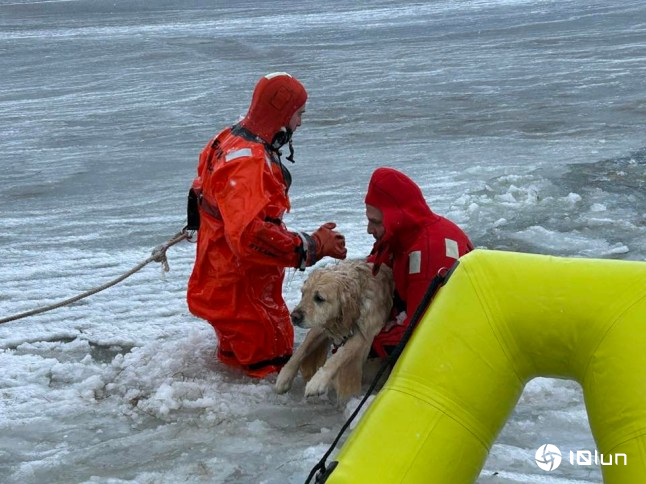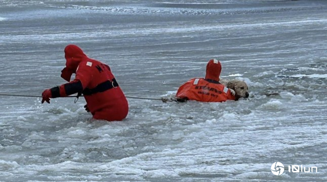 一只黄拉布拉多犬在罗德岛因误入覆盖池塘的薄冰层而跌入水中,被消防员成功救出。