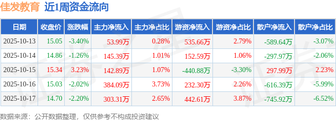 资金流向数据方面,本周佳发教育主力资金合计净流入1029.67万元,游资资金合计净流入922.27万元,散户资金合计净流出1951.93万元。本周资金流向一览见下表: