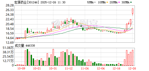 数据宝统计,截至10:42,宏源药业成交额10.22亿元,创上市以来新高。最新股价上涨20.00%,换手率25.28%。上一交易日该股全天成交额为8.25亿元。