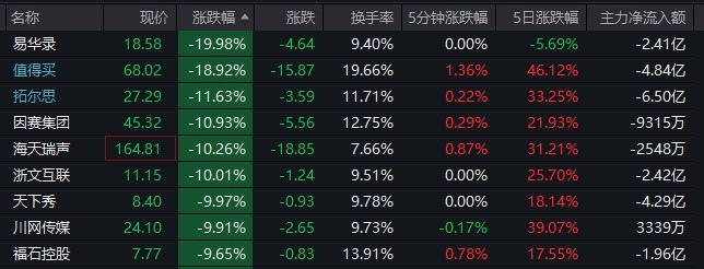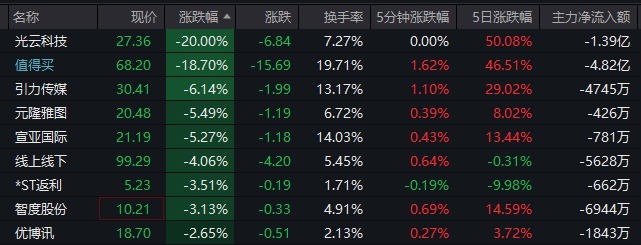 AI应用方面,光云科技20%跌停,值得买20%跌停后开板,易华录19.98%跌停,拓尔思、海天瑞声、因赛集团、蓝色光标等跌超10%,浙文互联、天下秀等跌停。