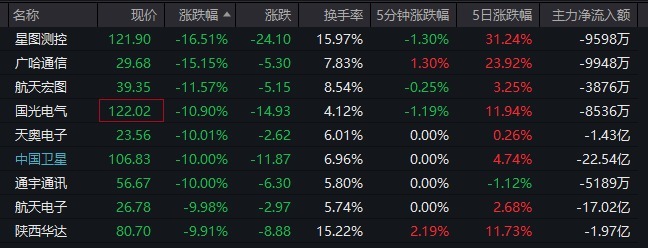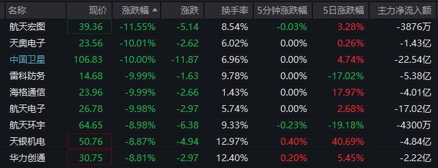热点方面,多只商业航天概念股大幅下跌,广哈通信、星图测控、陕西华达、航天宏图、国光电气等跌超10%,天奥电子、中国卫星、通宇通讯、航天电子、雷科防务、海格通信、长江通信等跌停。