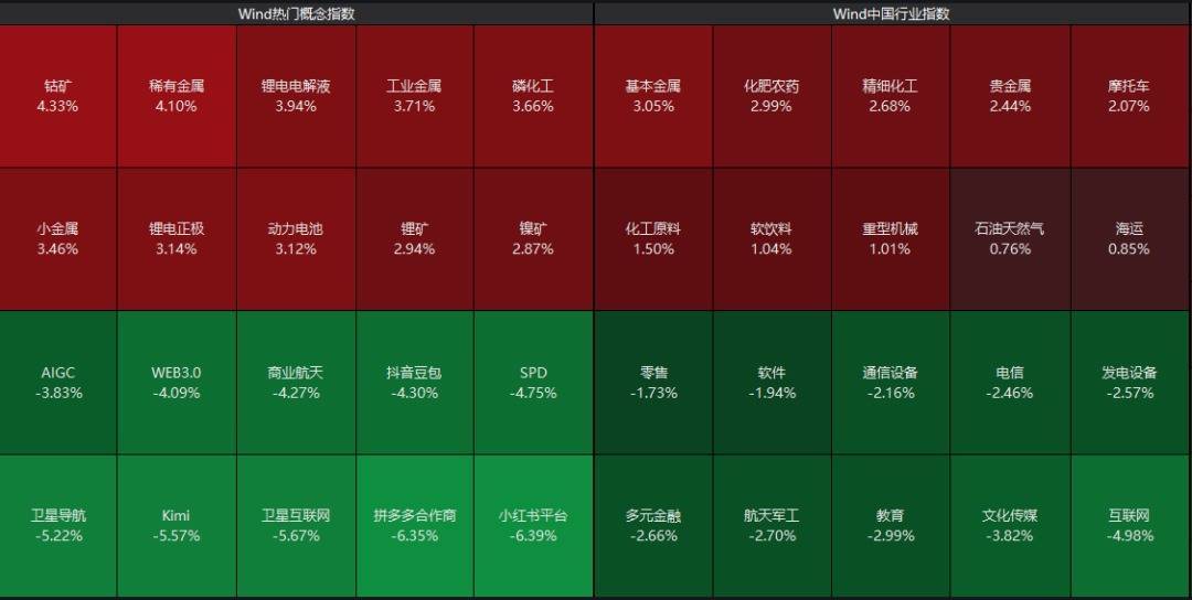钴矿、磷化工、稀有金属、锂电池、工业金属等概念涨幅居前;多个近期热门赛道“熄火”,其中AI应用、商业航天相关概念跌幅较大。